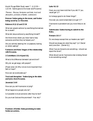 A Bible Study which relies heavily on discussion rather than leading. Using the film 'Moulin Rouge' as a starting point and then looking at a variety of passages (which can be obtained from the web in a variety of different translations) There are questions to help start discussion - some are harder than others.