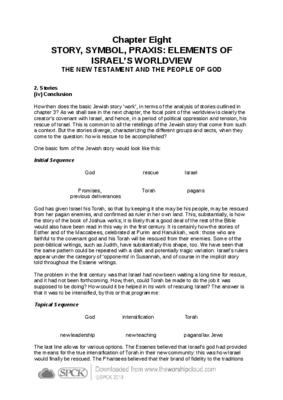 How then does the basic Jewish story ‘work’, in terms of the analysis of stories outlined in chapter 3? As we shall see in the next chapter, the focal point of the worldview is clearly the creator’s covenant with Israel, and hence, in a period of political oppression and tension, his rescue of Israel…