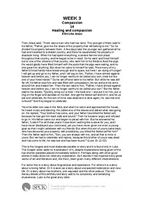 Then Jesus said, ‘There was a man who had two sons. The younger of them said to his father, “Father, give me the share of the property that will belong to me.” So he divided his property between them. A few days later the younger son gathered all he had and travelled to a distant country, and there he squandered his property in dissolute living. When he had spent everything, a severe famine took place throughout that country, and he began to be in need. So he went and hired himself out to one of the citizens of that country, who sent him to his fields to feed the pigs. He would gladly have filled himself with the pods that the pigs were eating; and no one gave him anything. But when he came to himself he said, “How many of my father’s hired hands have bread enough and to spare, but here I am dying of hunger! I will get up and go to my father, and I will say to him, ‘Father, I have sinned against heaven and before you; I am no longer worthy to be called your son; treat me like one of your hired hands.’” So he set off and went to his father. But while he was still far off, his father saw him and was filled with compassion; he ran and put his arms around him and kissed him. Then the son said to him, “Father, I have sinned against heaven and before you; I am no longer worthy to be called your son.” But the father said to his slaves, “Quickly, bring out a robe – the best one – and put it on him; put a ring on his finger and sandals on his feet. And get the fatted calf and kill it, and let us eat and celebrate; for this son of mine was dead and is alive again; he was lost and is found!” And they began to celebrate...