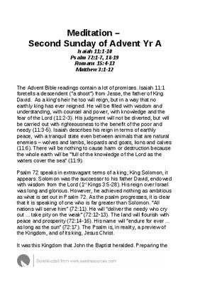 The Advent Bible readings contain a lot of promises. Isaiah 11:1 foretells a descendent (“a shoot”) from Jesse, the father of King David. As a king’s heir he too will reign, but in a way that no earthly king has ever reigned. He will be filled with wisdom and understanding, with counsel and power, with knowledge and the fear of the Lord (11:2-3). His judgment will not be diverted, but will be carried out with righteousness to the benefit of the poor and needy (11:3-5). Isaiah describes his reign in terms of earthly peace, with a tranquil state even between animals that are natural enemies – wolves and lambs, leopards and goats, lions and calves (11:6). There will be nothing to cause harm or destruction because the whole earth will be “full of the knowledge of the Lord as the waters cover the sea” (11:9)...