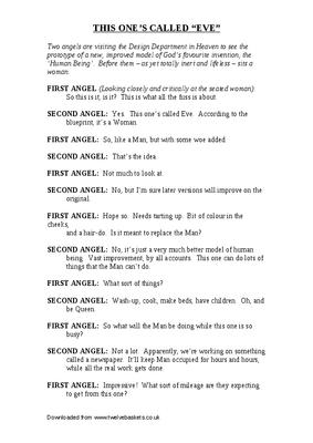A short sketch for three people (one of whom, Eve, doesn't speak), in which two Angels visit the Design Department in Heaven to look at God's latest invention.