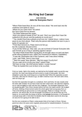 But then the opposition brought on a substitute, fresh and lively. He was exactly what the other side needed. He put fresh heart into their whole team. We watched, helpless, as our side struggled to cope with the new challenge. The inevitable happened. First an equalizing goal. Then, three minutes before the end, the match-winner. We trudged off home, thinking of that moment when the whole game had swung away from us. That is the feeling we get at verse 12 in this passage. Pilate is in charge. He’s the governor. His word is law. He can kill people if he wants to; he can let them go if he wants to. He could order the troops to kill the chief priests themselves, if he thought he could get away with it. And when he decides that he really does want to let Jesus go, we assume he is going to be able to do it...