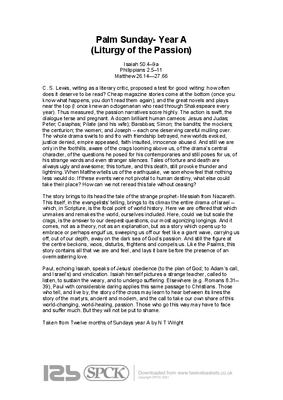 C. S. Lewis, writing as a literary critic, proposed a test for good writing: how often does it deserve to be read? Cheap magazine stories come at the bottom (once you know what happens, you don’t read them again), and the great novels and plays near the top (I once knew an octogenarian who read through Shakespeare every year). Thus measured, the passion narratives score highly. The action is swift, the dialogue terse and pregnant. A dozen brilliant human cameos: Jesus and Judas; Peter; Caiaphas; Pilate (and his wife); Barabbas...
